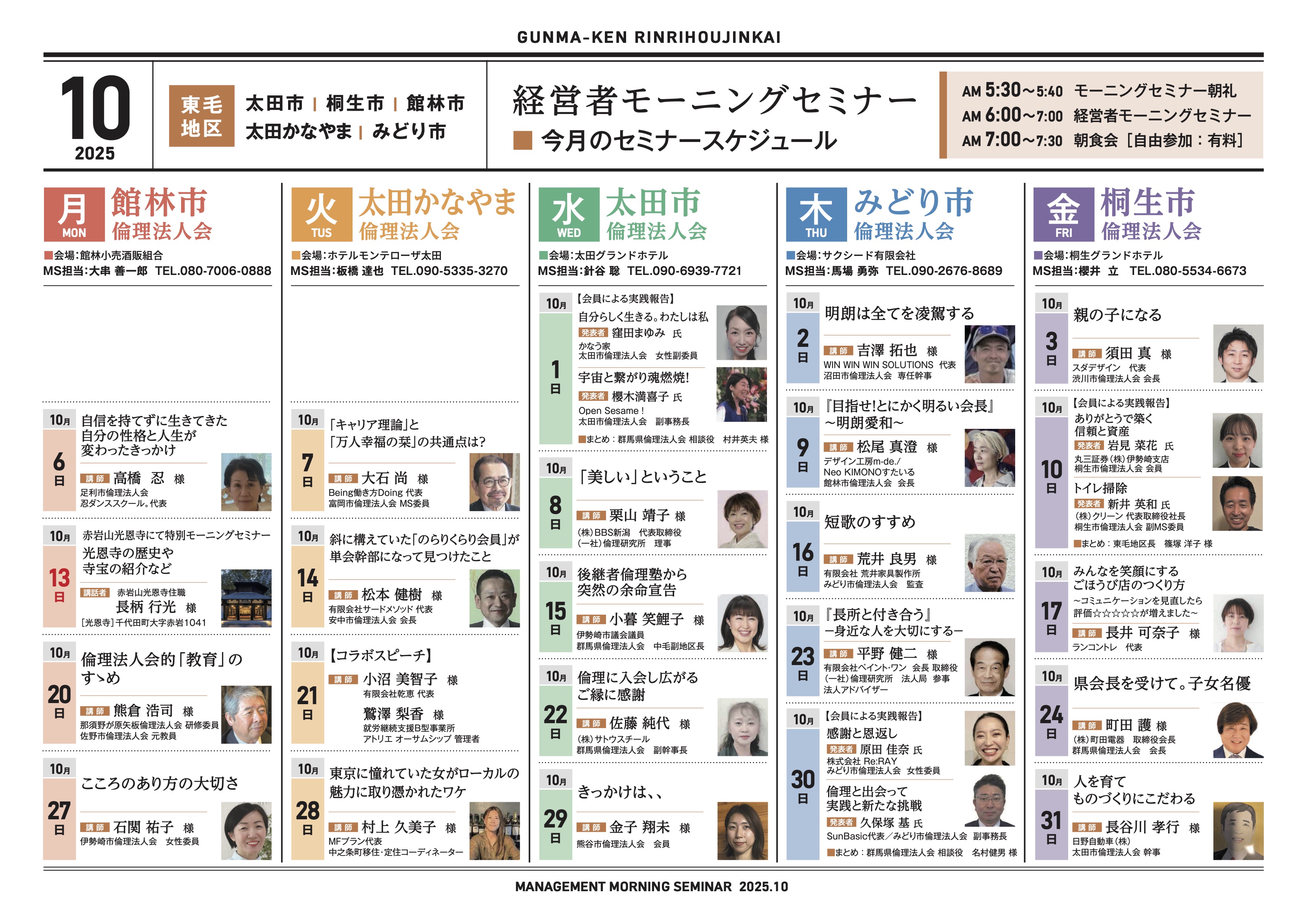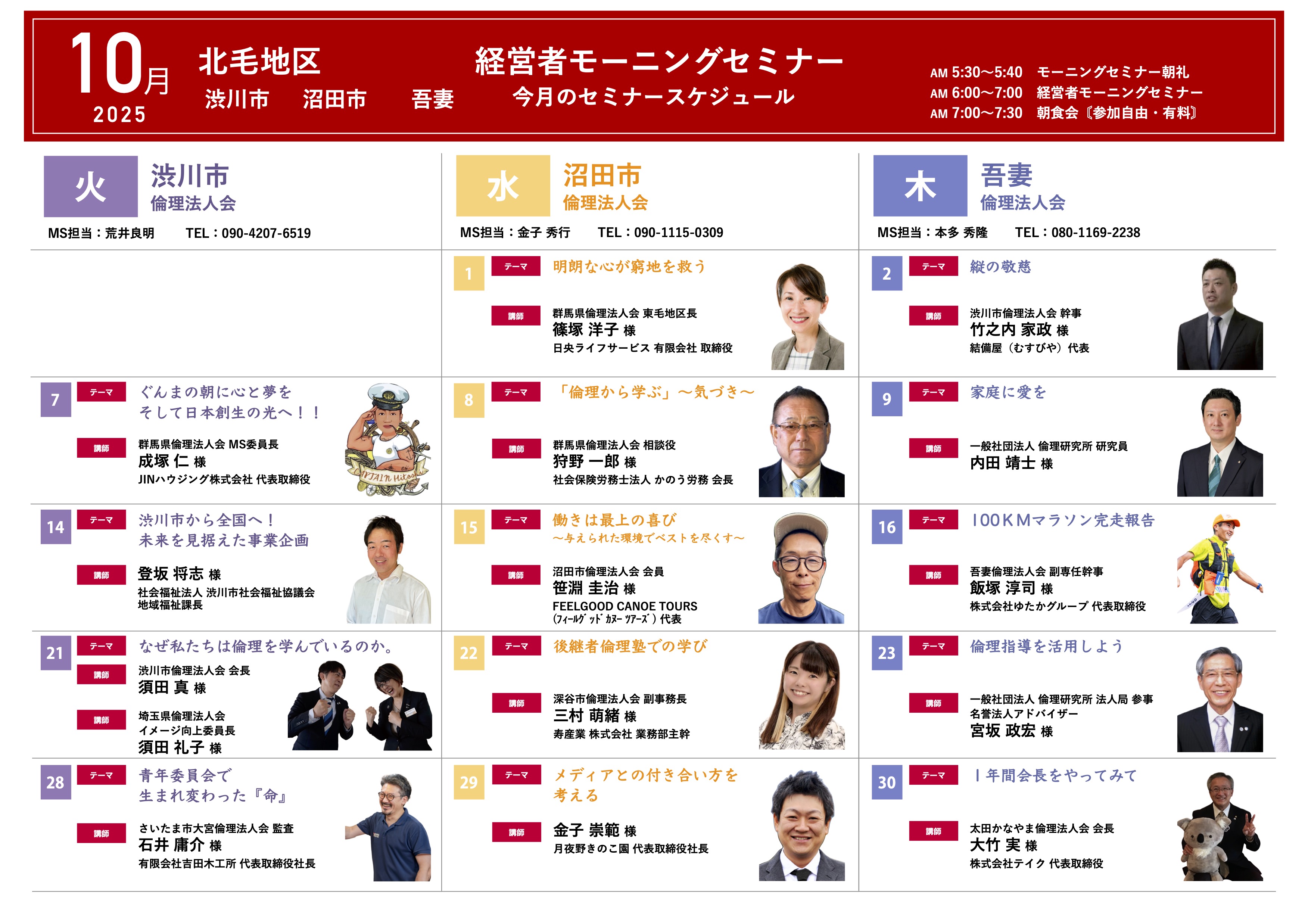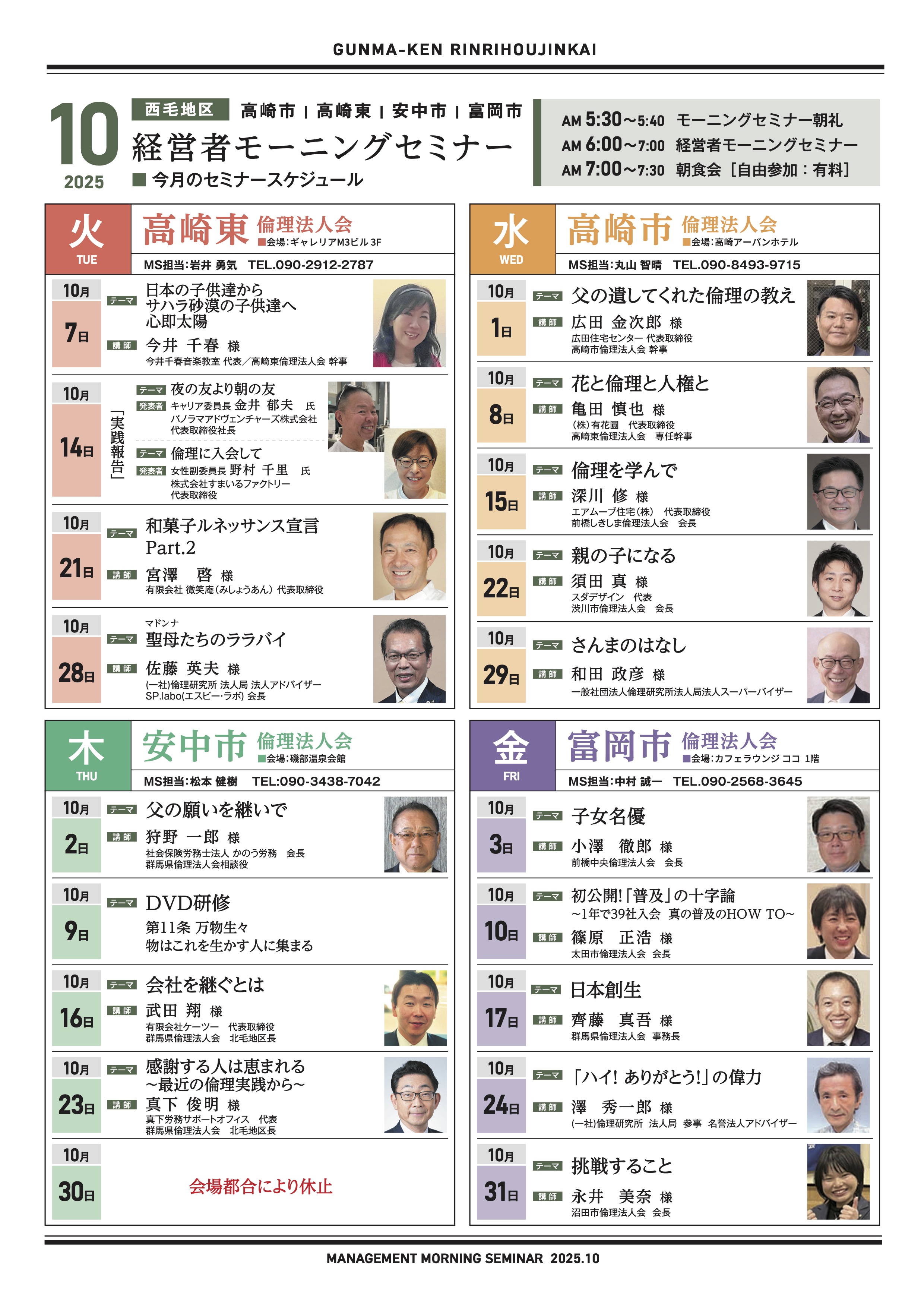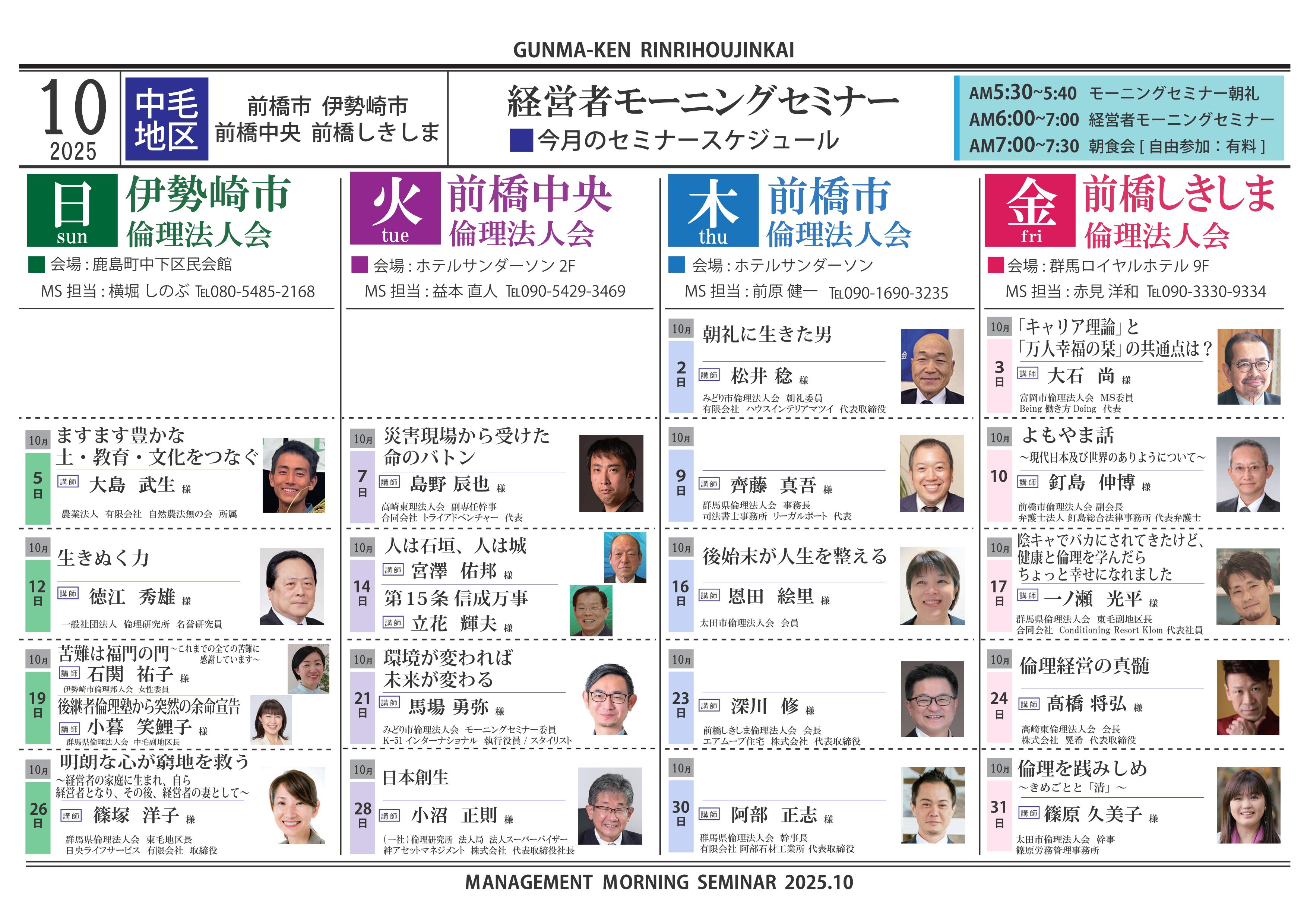 朝を活用する企業は勝つ! 元気な会社はトップが早起き! 群馬県では16ヵ所の会場で毎週1回、早朝に経営者モーニングセミナーを開催しています。 参加者は朝型の生活習慣を身につけながら、純粋倫理の学びと各界で活躍する講師の体験談などを通して[…]